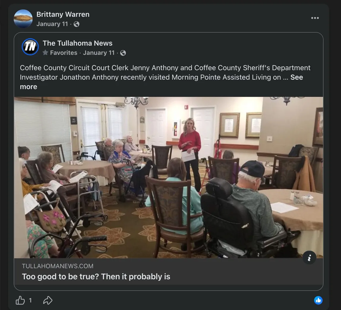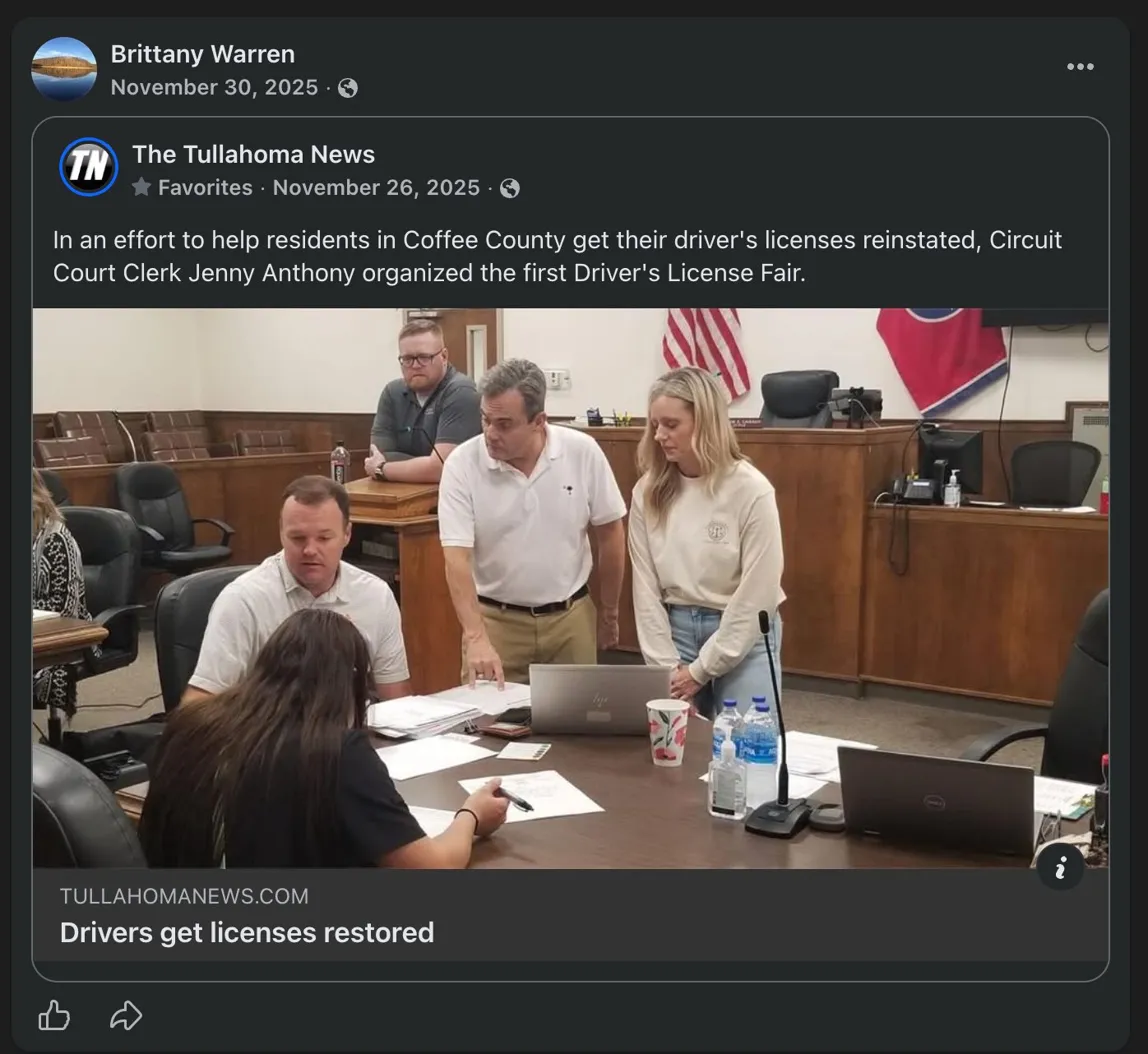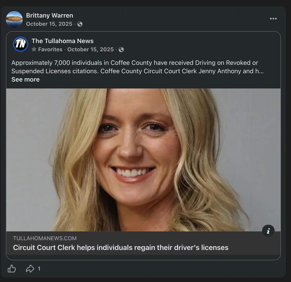 Throughout this period, the profile has also been publicly posting and sharing content supportive of Jenny Anthony, including coverage from the Tullahoma News favorable to the Clerk.