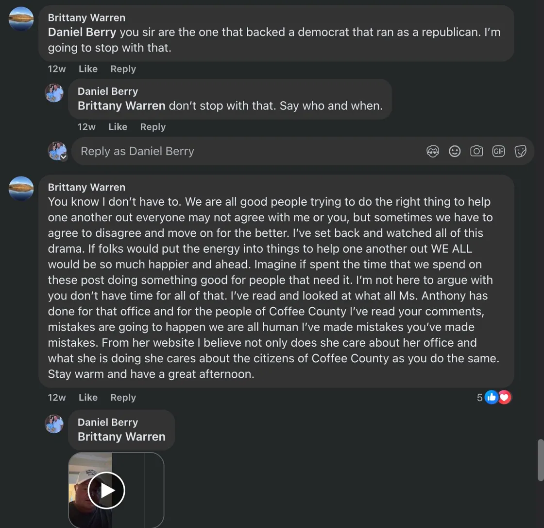 In February, the Brittany Warren profile engaged Berry in a comment exchange on a local Facebook post -- raising the subject of Democrats running on the Republican ticket and defending Jenny Anthony. The exchange was not on an Unfiltered post.